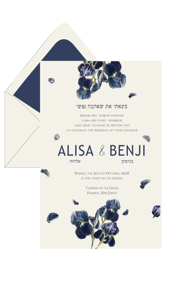 Stunning Jewish wedding invitations adorned with beautiful bluish-toned flowers surrounding the design. At the top, the heading features the heartfelt Hebrew pasook: ‘מצאתי את שאהבה נפשיי’ (‘I have found the one whom my soul loves’). Beneath this, the details of the Jewish wedding celebration are elegantly printed, blending tradition with a modern flair. The bride and groom’s names, in both Hebrew and English, are prominently displayed in bold, contemporary typography, creating a stylish and sophisticated look for this memorable occasion.