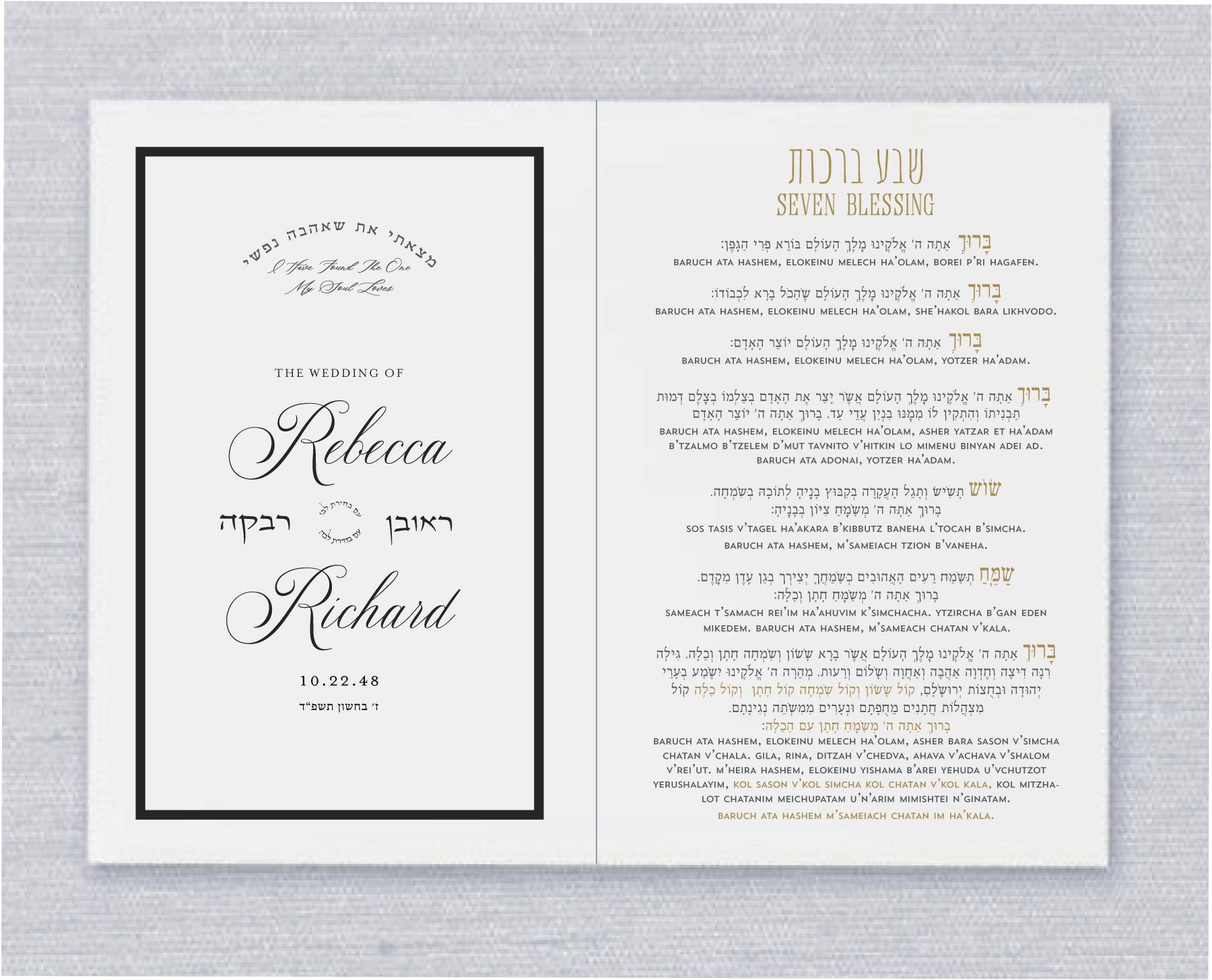 Black Tie Invited Birkat Hamazon Bencher Folder exquisite folder includes four pages dedicated to Birkat Hamazon and the Sheva Brachot, all beautifully presented in the Hebrew language, preserving the traditional and sacred essence of these blessings.