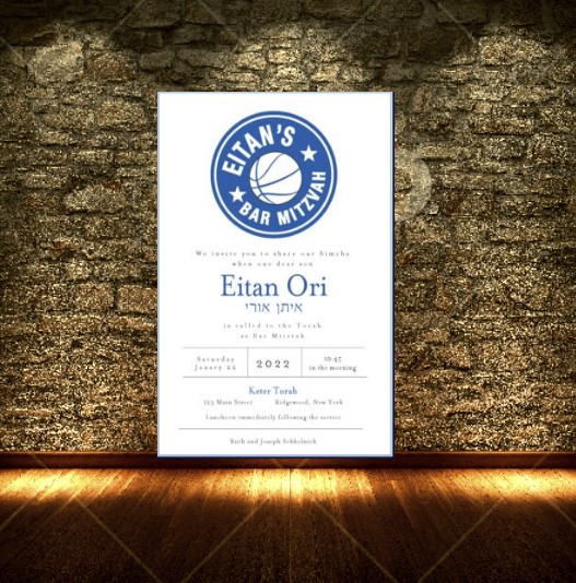 Elegant Bar Mitzvah Invitation. Basketball logo along with Navy and Charcoal Ink.
