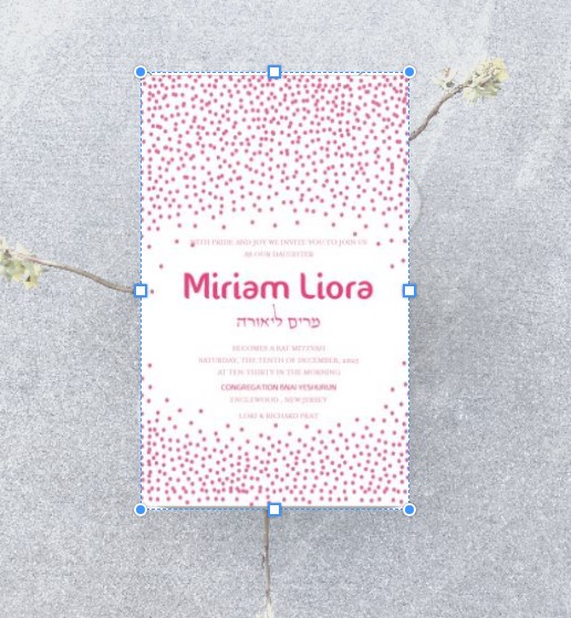 This exquisite Bat Mitzvah invitation features playful flamingo dots in pink and orange along the top and bottom, reflecting the vibrant spirit of the celebration. At the center, the Bat Mitzvah details are elegantly showcased, with the name of the Bat Mitzvah girl beautifully presented in both Hebrew and English, adding a personal and meaningful touch. The design seamlessly blends tradition with modern sophistication, making it the perfect choice for a memorable and stylish celebration.