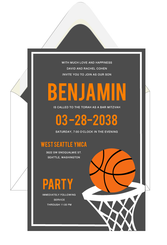 This sport-themed Hoop It Up Bar Mitzvah Invitation features a bold basketball graphic and modern type. Matching lined envelopes, rsvp cards and thank you notes are also available.